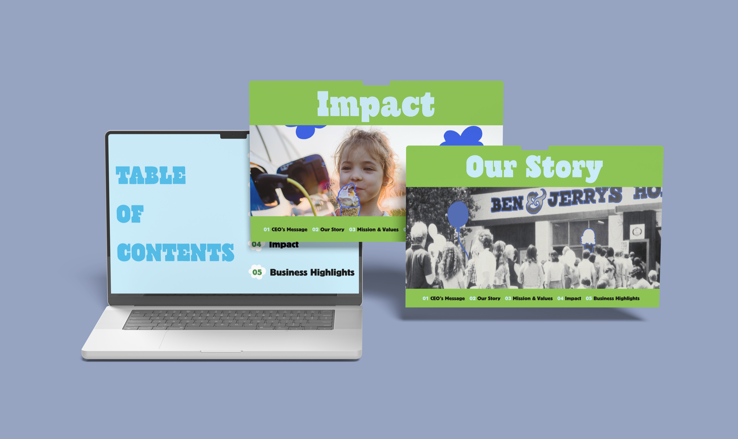 This annual report is designed as an engaging, scrolling PDF that reflects Ben & Jerry’s belief that values should guide every aspect of business. The content places the company’s missions and values at the forefront, treating impact as integral rather than supplemental to performance. Adhering closely to brand standards, the report includes small, hand-drawn illustrations consistent with Ben & Jerry’s art style to reinforce the company’s authenticity and approachability. The narrative and design emphasize transparency, accountability, and purpose, reflecting Ben & Jerry’s unmistakable voice and commitment to doing business differently.